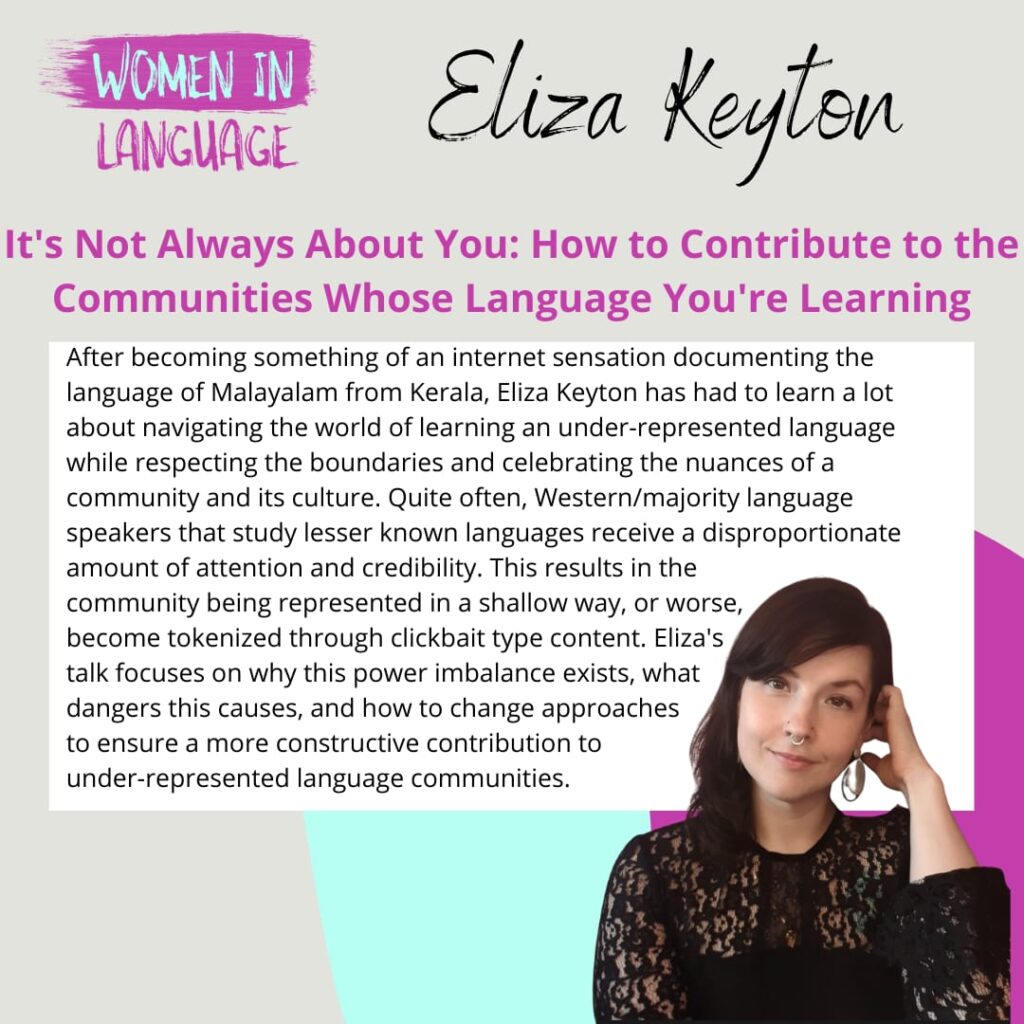 I started EliKutty on my own and my husband has been a big support. Many people assume I've learned from him directly or he has creative control on my work, but I've done a lot of things on my own, just with my curiosity and creativity leading the way. However, I have relied a lot on my tutors from italki and muthassi.in to help me stay motivated learning and improving my Malayalam. My followers are mostly Malayalees, many who are intrigued with my work and learning neat things about their language that they hadn't considered before. In my classes, I have a mix of foreigners from New Zealand, Europe, Canada, etc, as well as NRIs who are trying to get back in touch with their mother tongue.
